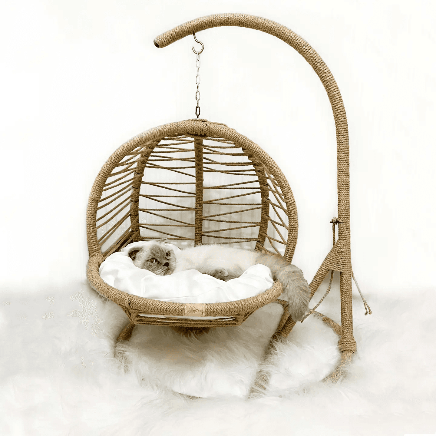 This rocking pet bed is covered with natural jute rope on a solid metal frame, creating a perfect balance between functionality, aesthetics, and sustainability. Its contemporary design makes it ideal for any environment, becoming a decorative element as well as a comfortable refuge for the pet. Its ergonomic shape allows it to be easily placed in any corner of the house, making it ideal even for smaller spaces.